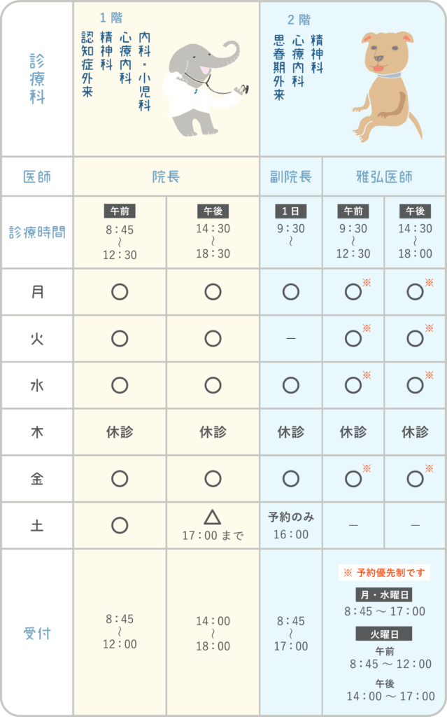注)予約は再診のみとさせていただきます。初診で診察をご希望の方は、別の日に受診していただくか、雅弘医師の診察を受診ください。